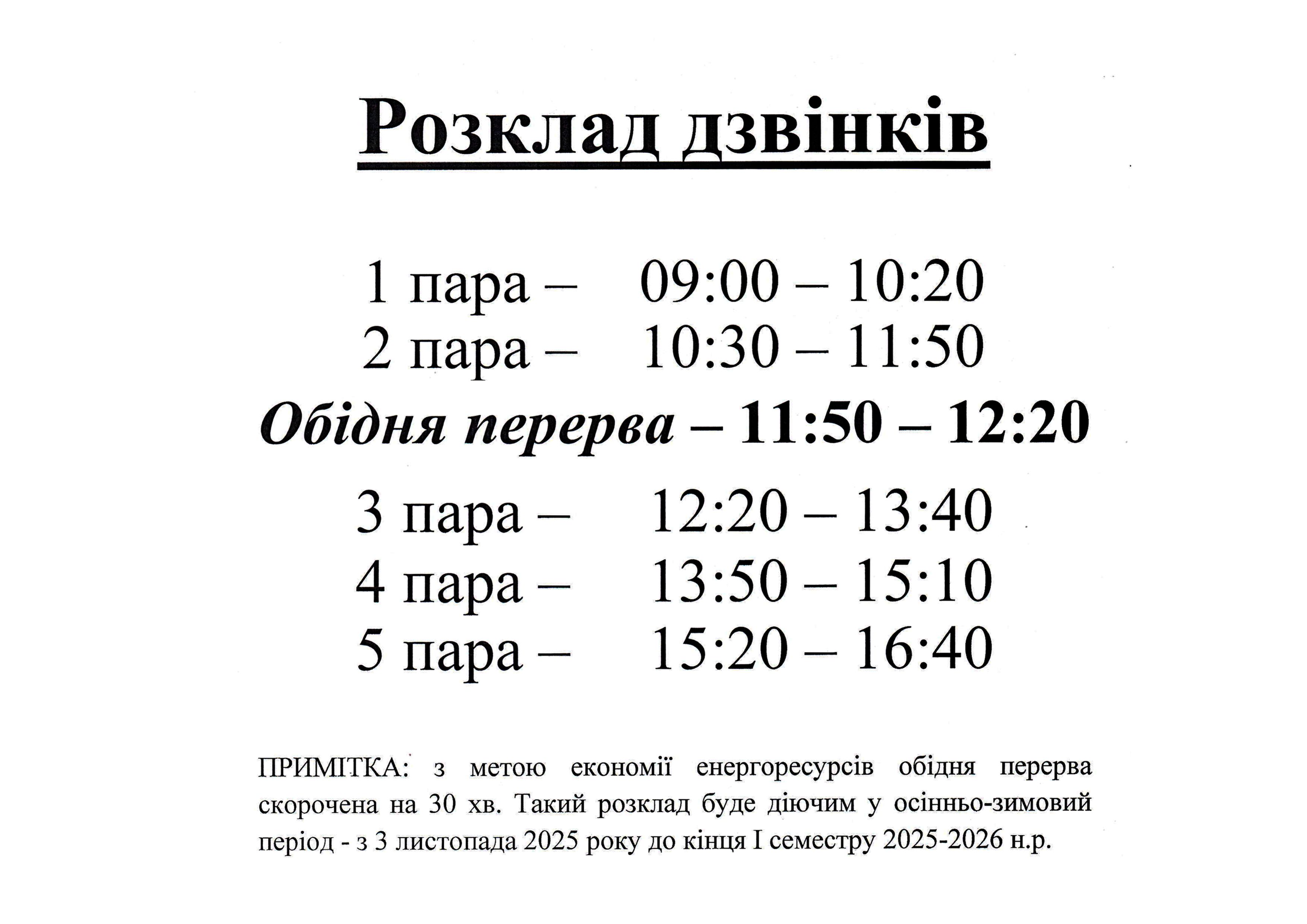 28 жовт.,2025 НОВИНИ COMMENTS Перегляди: 81 Tags: НОВИНИ, СТУДЕНСТВО, НАВЧАЛЬНИЙ ПРОЦЕС Змінено розклад дзвінків Детальніше
