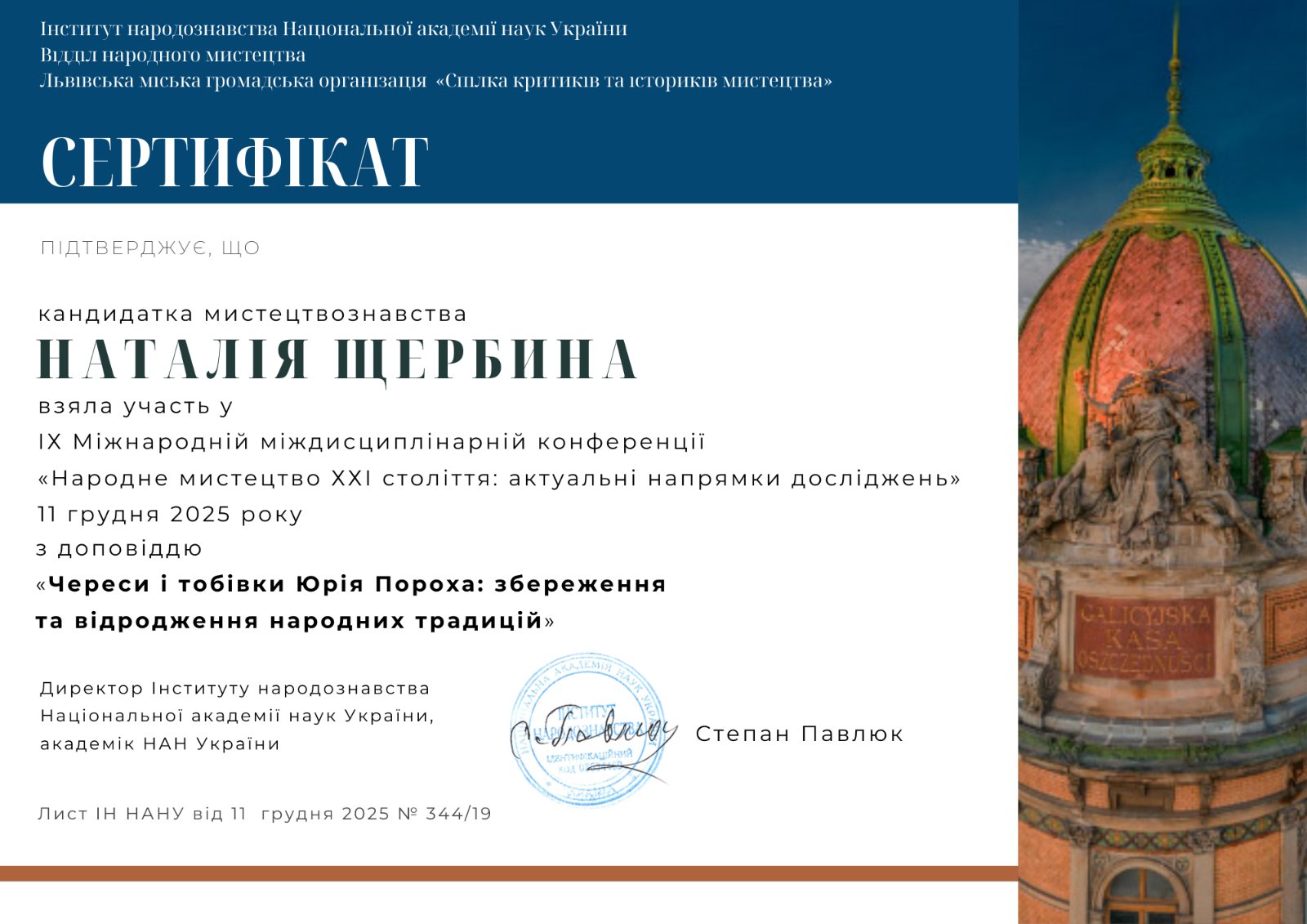 Тема доповіді: «Кушнірські вироби на Покутті та Західному Поділлі: конструктивно-технологічний аспект» // Науково-практична конференція професорсько-викладацького складу, аспірантів і здобувачів ЛНАМ «Мистецтво та епоха: культурно-історичний і практичний аспекти», м. Львів, 23 травня 2013 р.