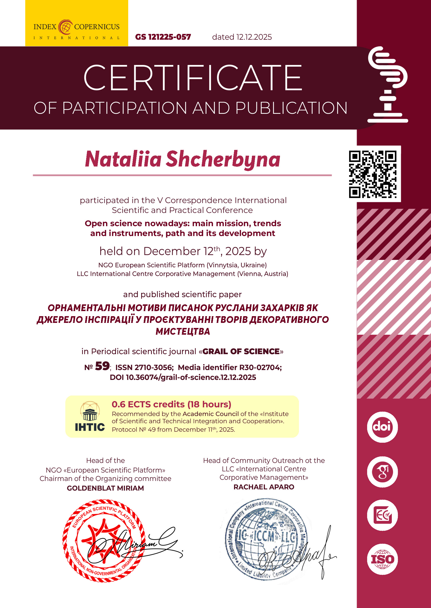 Introduction to Systematic Review and Meta-Analysis Course. Authorized by European Academy of Sciences and Research. Тривалість - 14 годин (0,46 кредиту ЄКТС). Форма навчання - дистанційна. Сертифікат № XV-16-293849248-22. Гамбург, Німеччина, 2022 р.