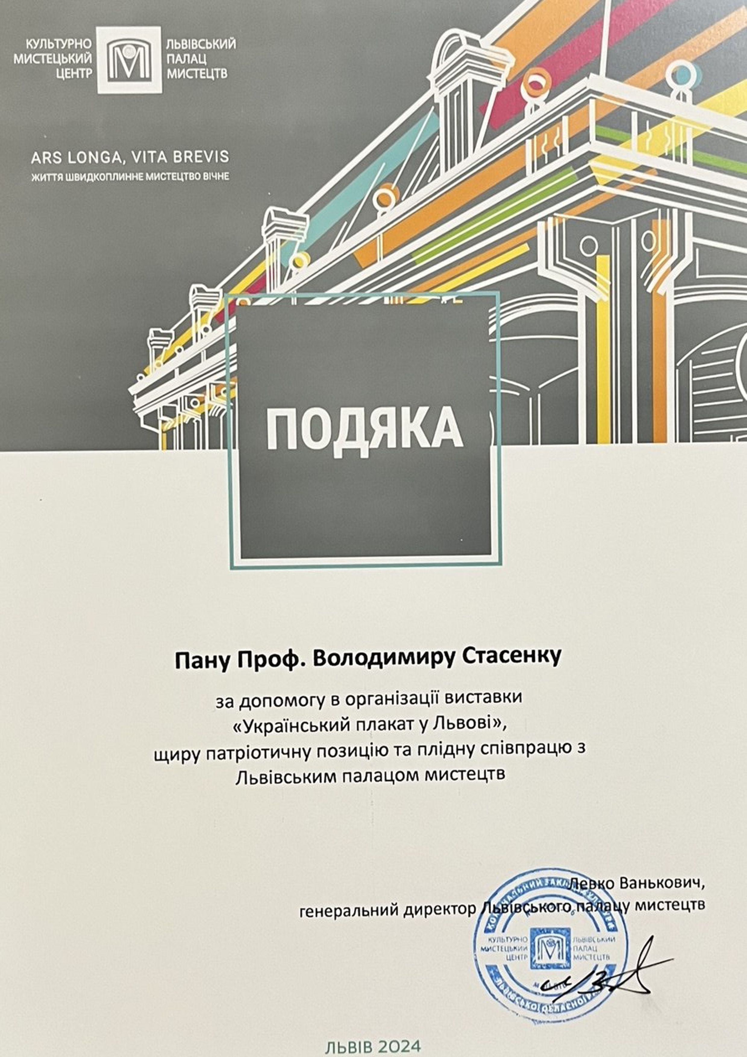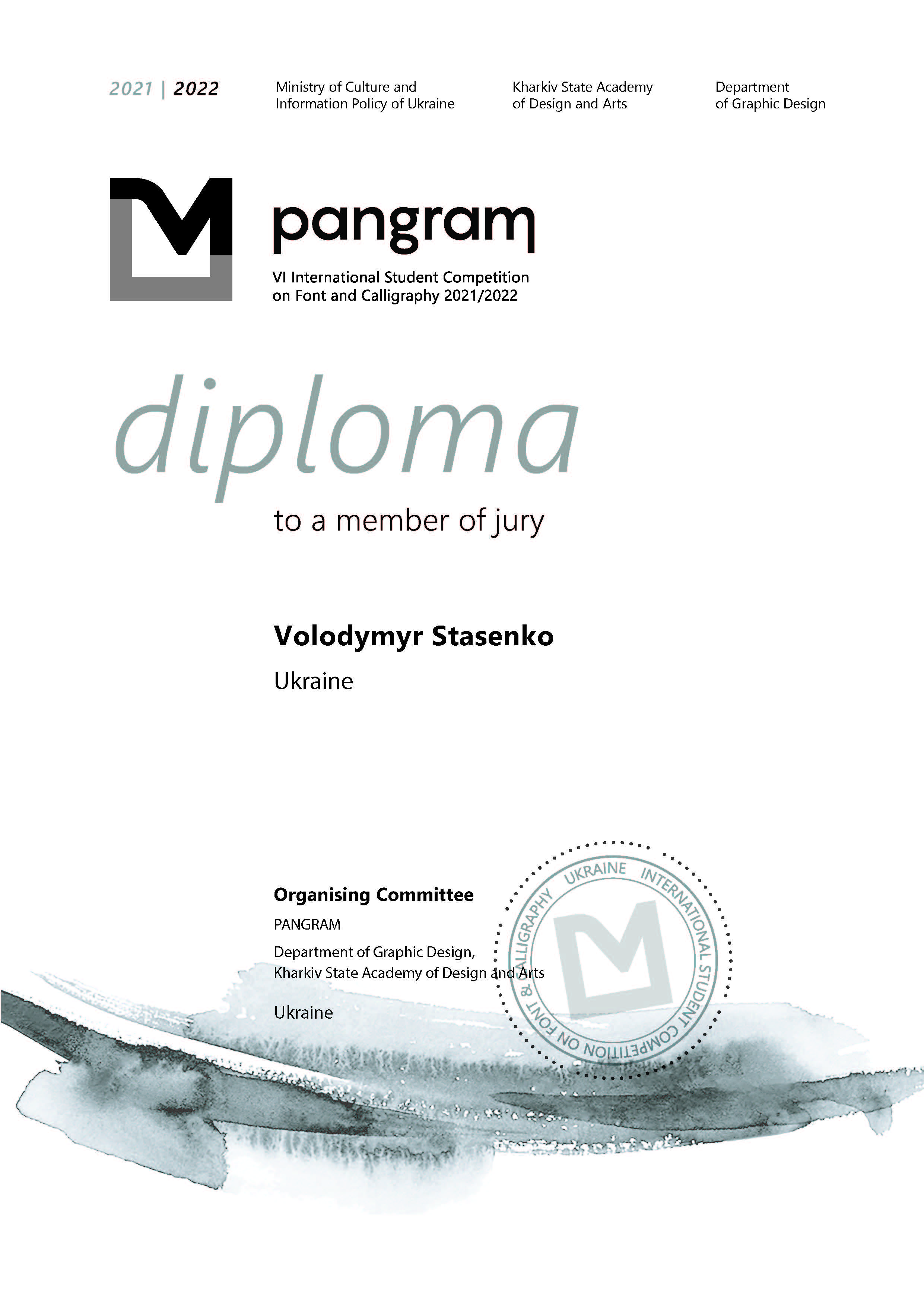 - Член журі Міжнародний студентський конкурс з шрифту і каліграфії «Pangram». Стасенко В.В.
