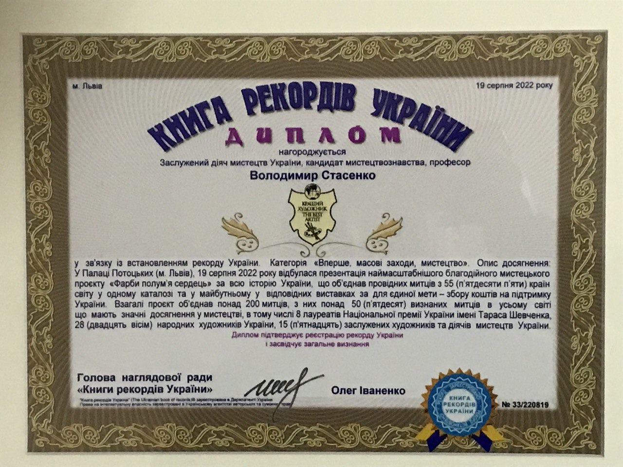- Встановлення рекорду України у категорії «Вперше, масові заходи, мистецтво». Диплом Книги рекордів України участь у наймасштабнішому благодійному мистецькому проекті «Фарби полум’я сердець». 19 серпня 2022 року. Палац Потоцьких (Львів).