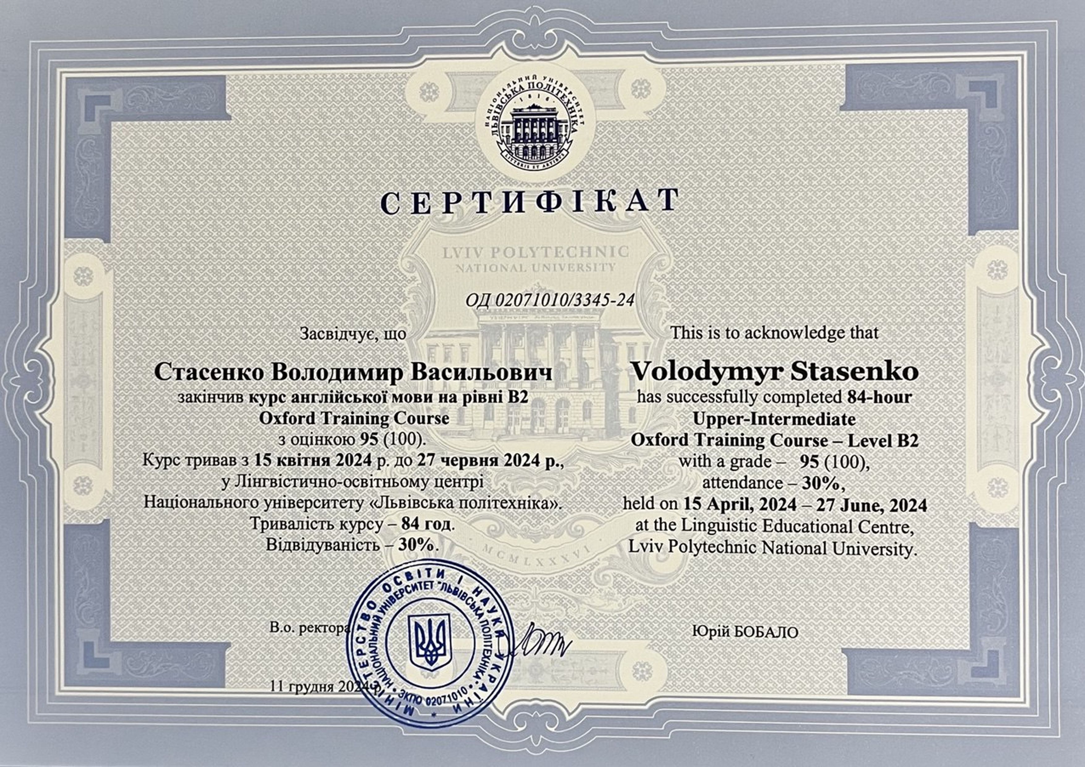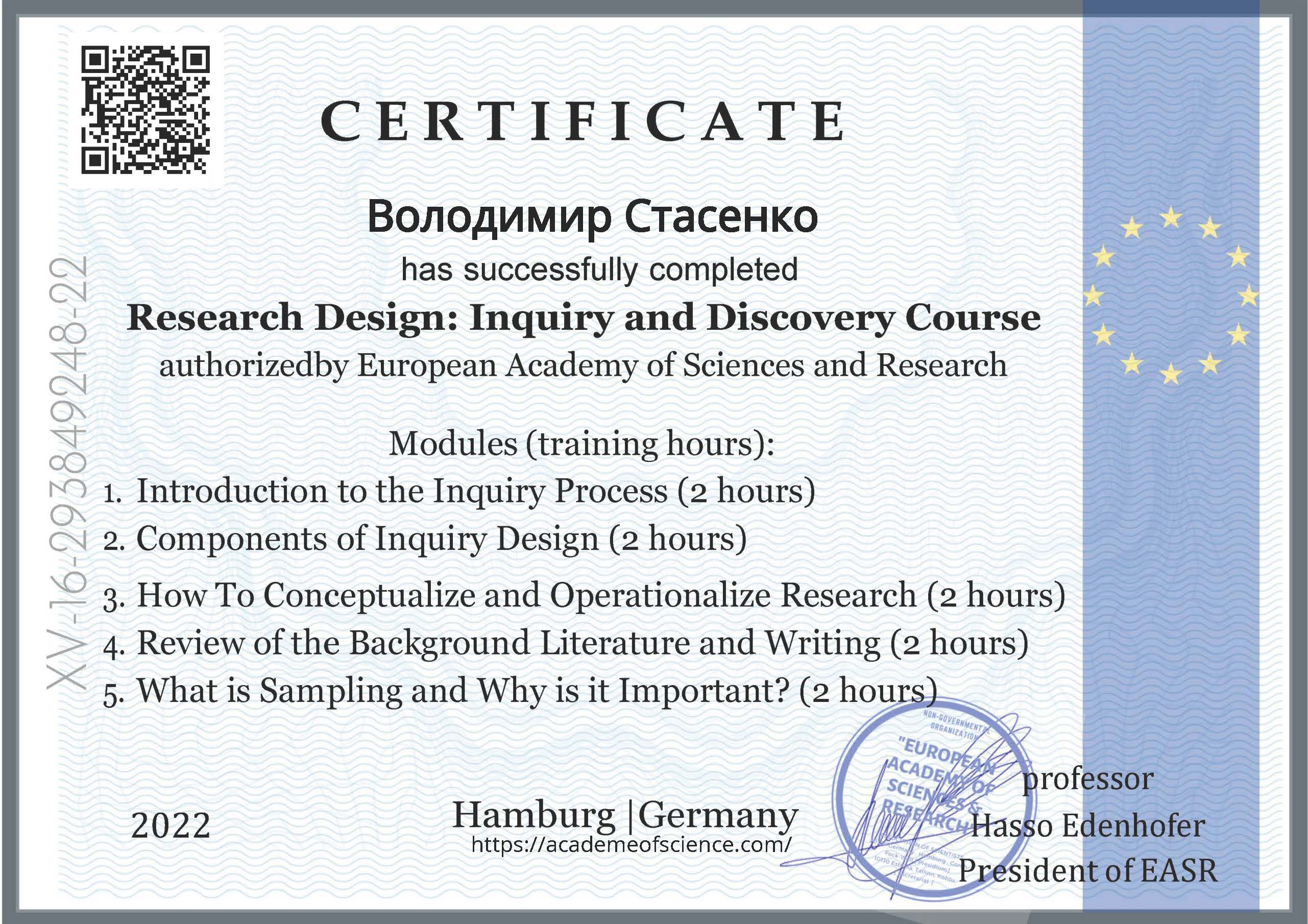 5. Стажування «Research Design Inquiry and Discovery Course» у Європейській академії наук і досліджень. Гамбург, Німеччина. Загальний обсяг - 10 годин. Стасенко В.В. 2022.
