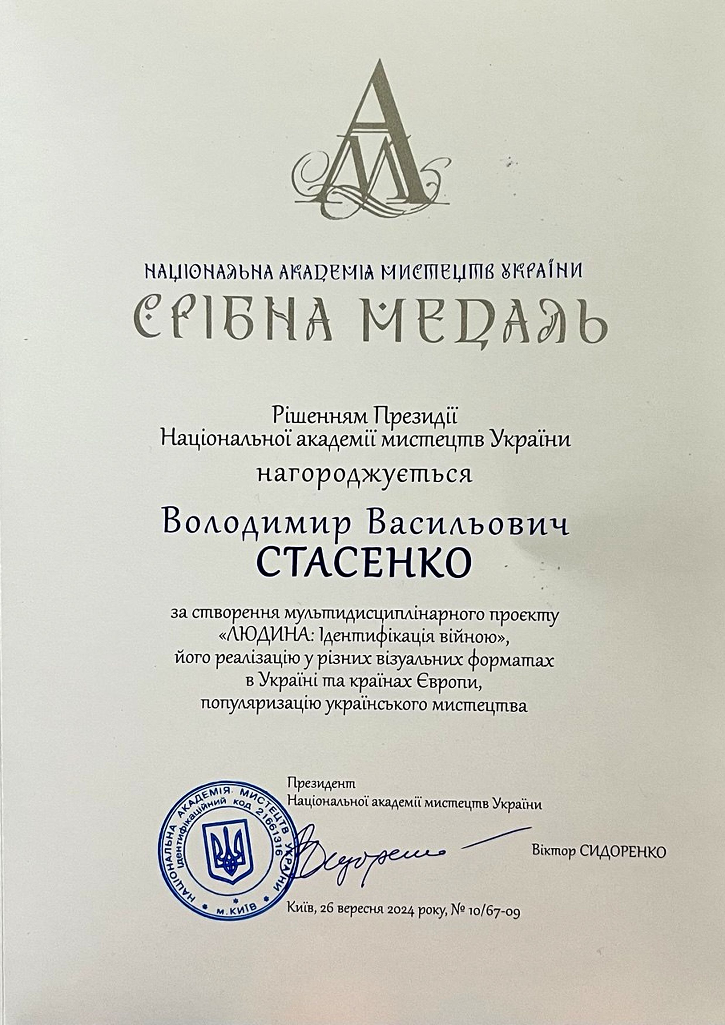 - Нагороджений грамотою Національної академії сухопутних військ імені гетьмана Петра Сагайдачного як волонтер за значний внесок у зміцнення обороноздатності. 05 грудня 2022 року. Стасенко В.В.