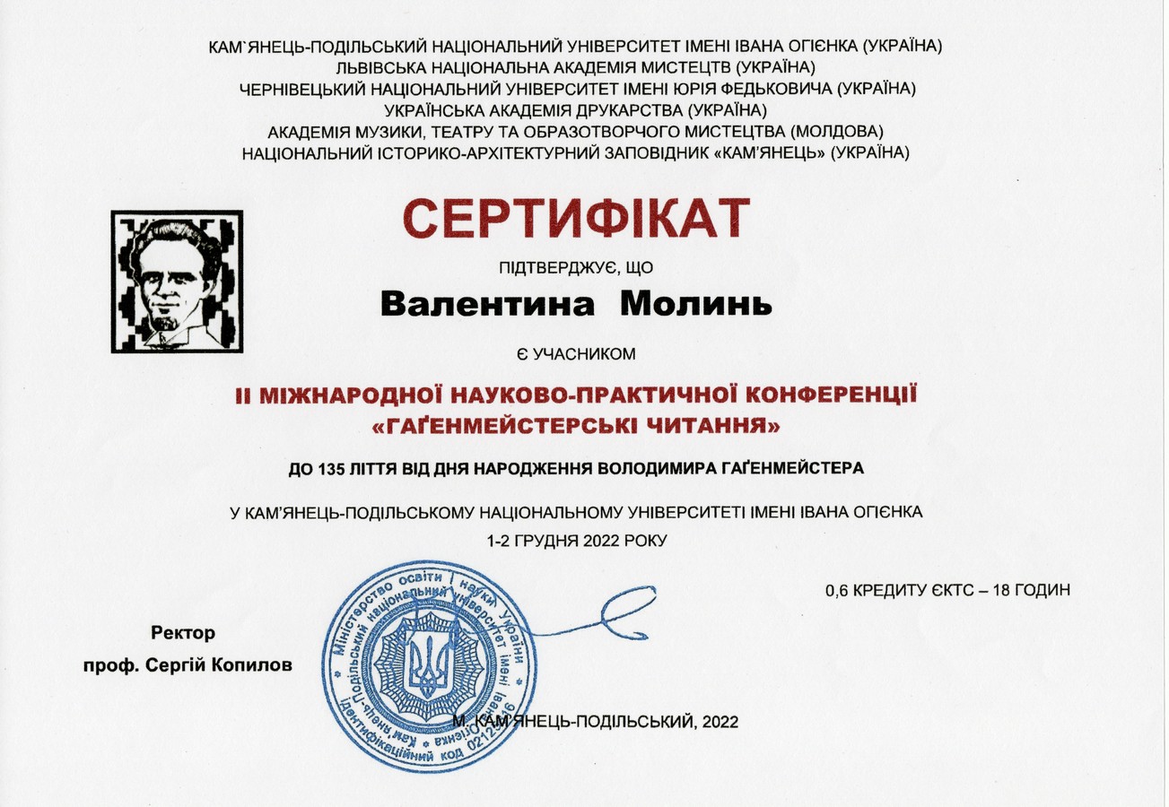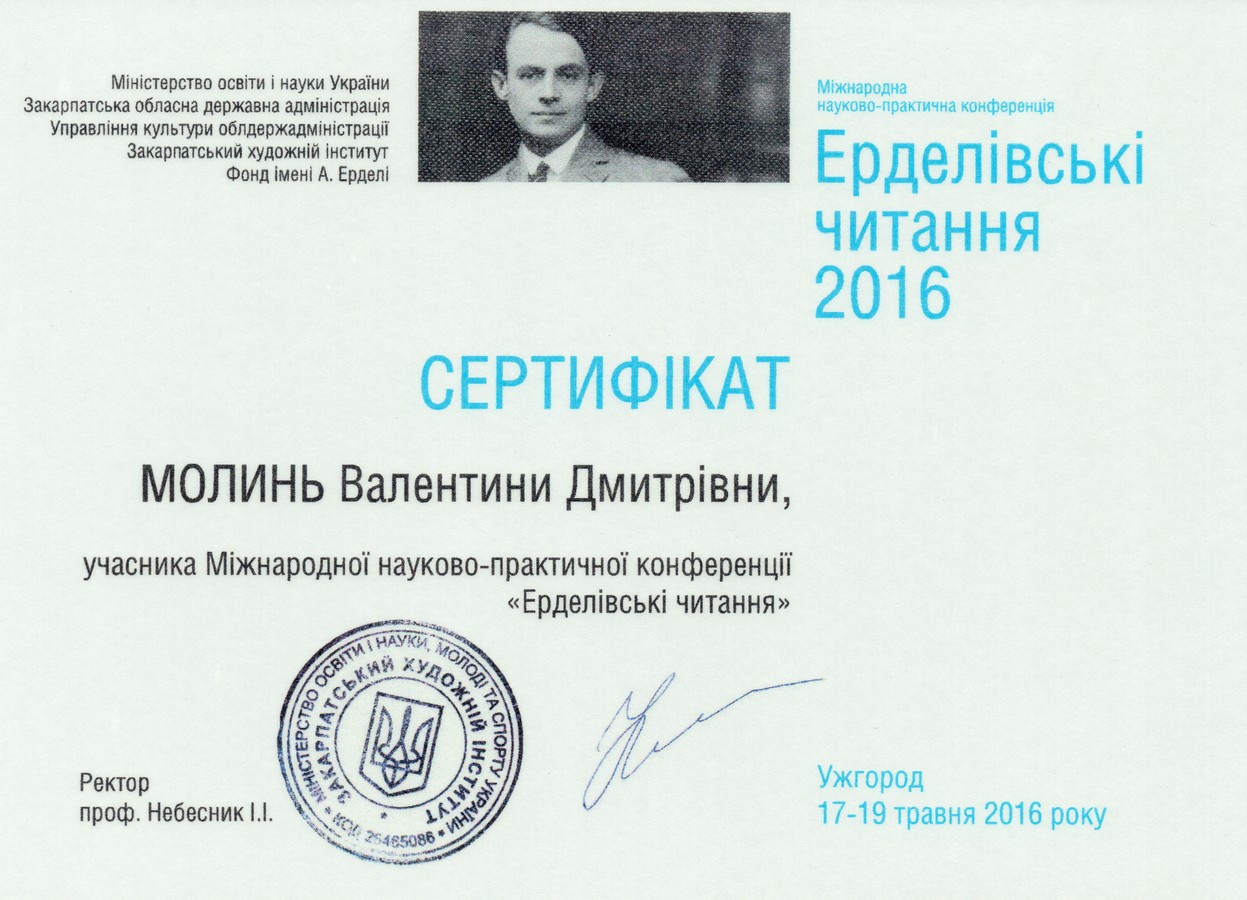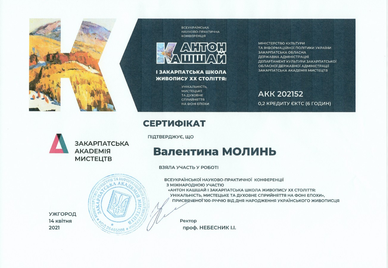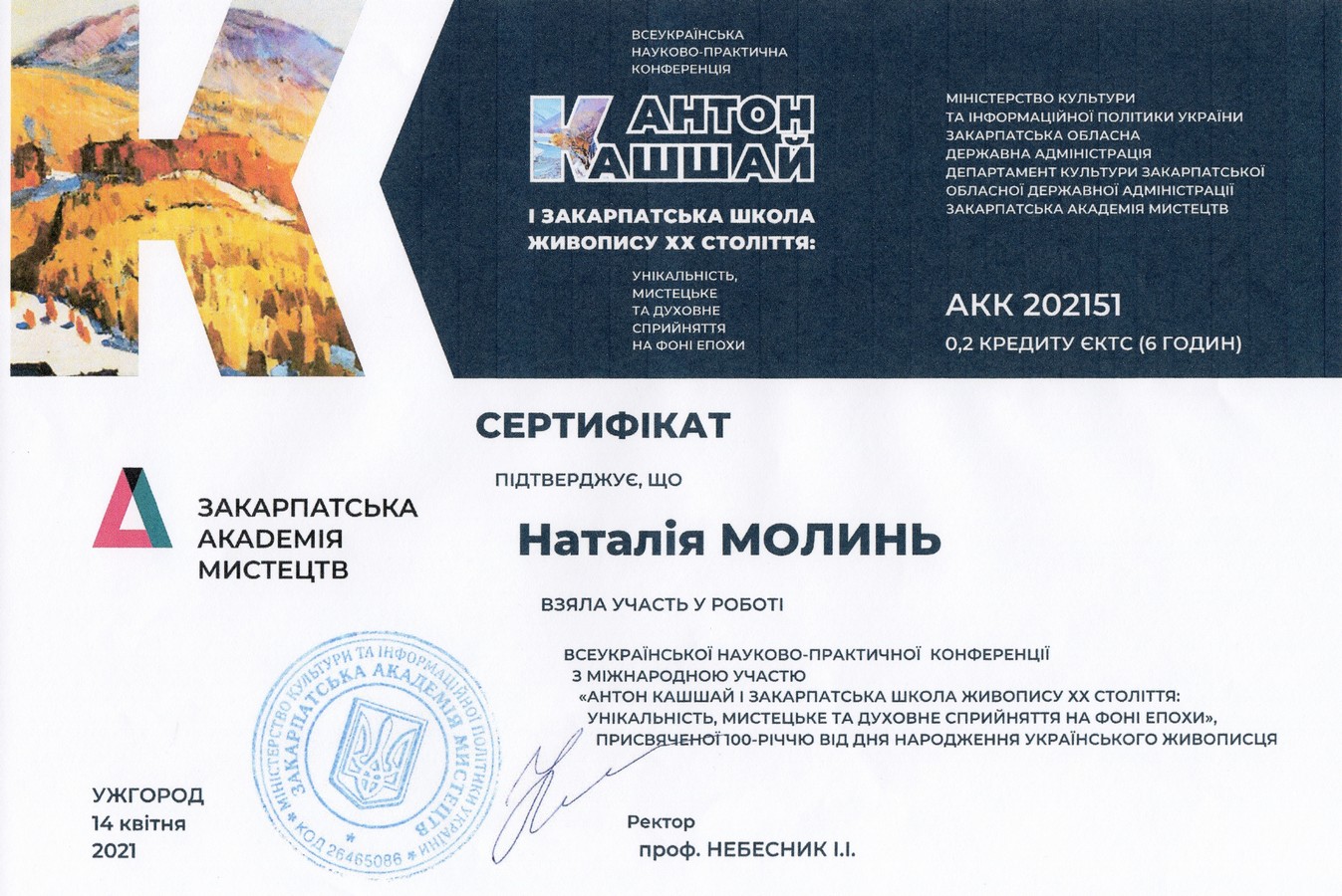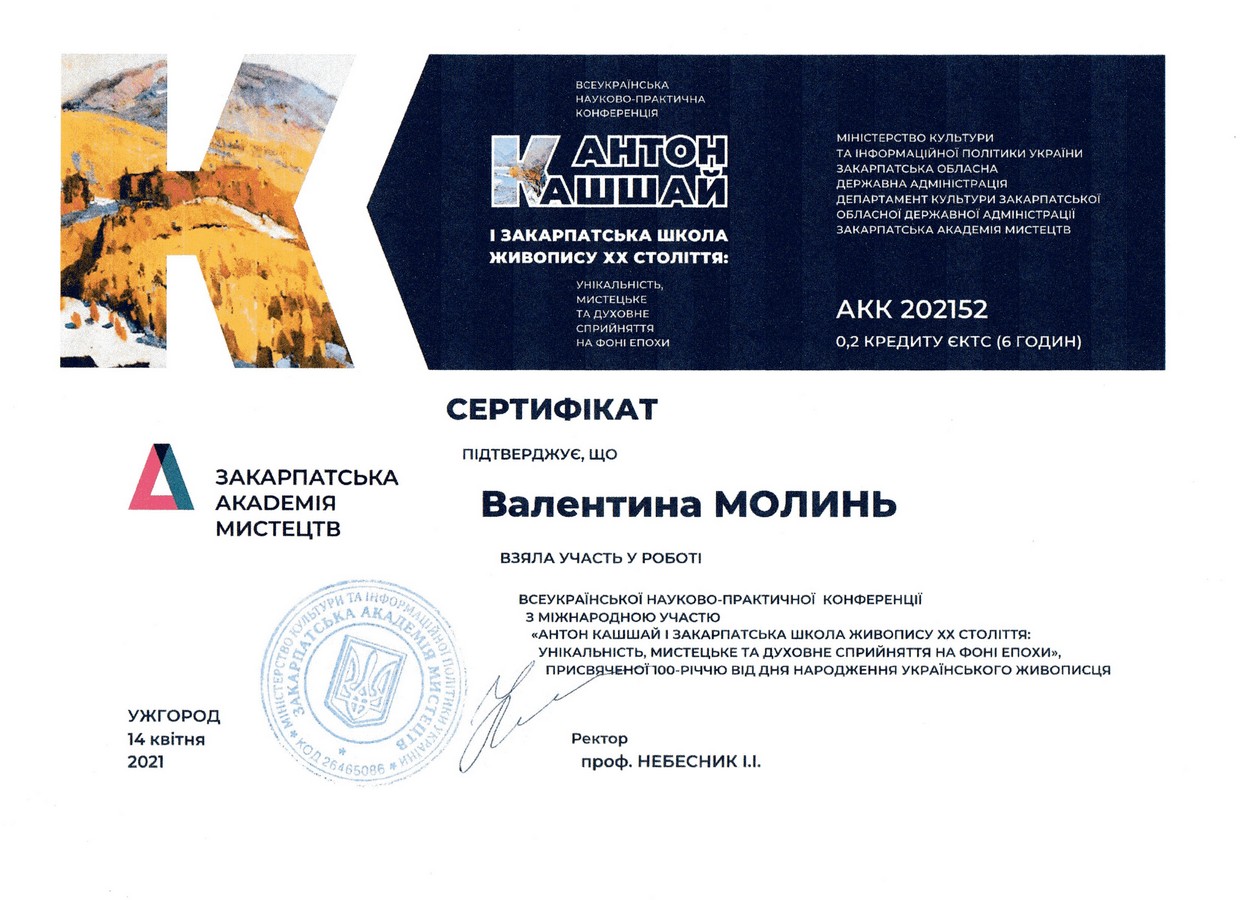 Міжнародна науково-практична конференція "Ерделівські читання - 2021", м. Ужгород, Закарпатська академія мистецтв, 25-26 травня 2021 р. Тема доповіді: «Розмаїття мистецького діапазону: персональні виставки викладачів Косівського інституту ПДМ ЛНАМ».