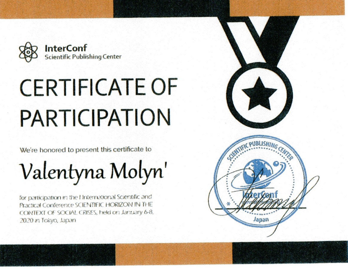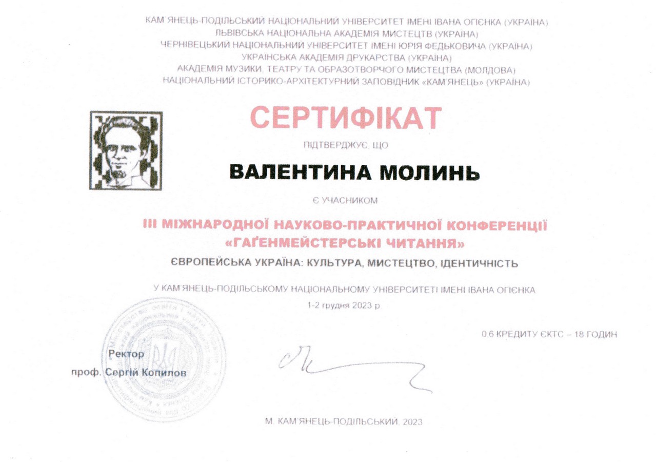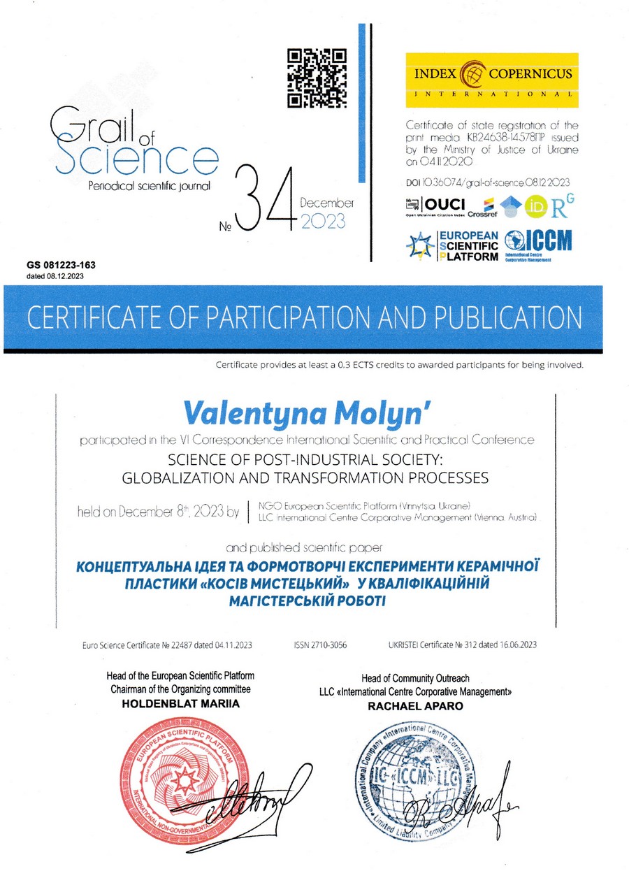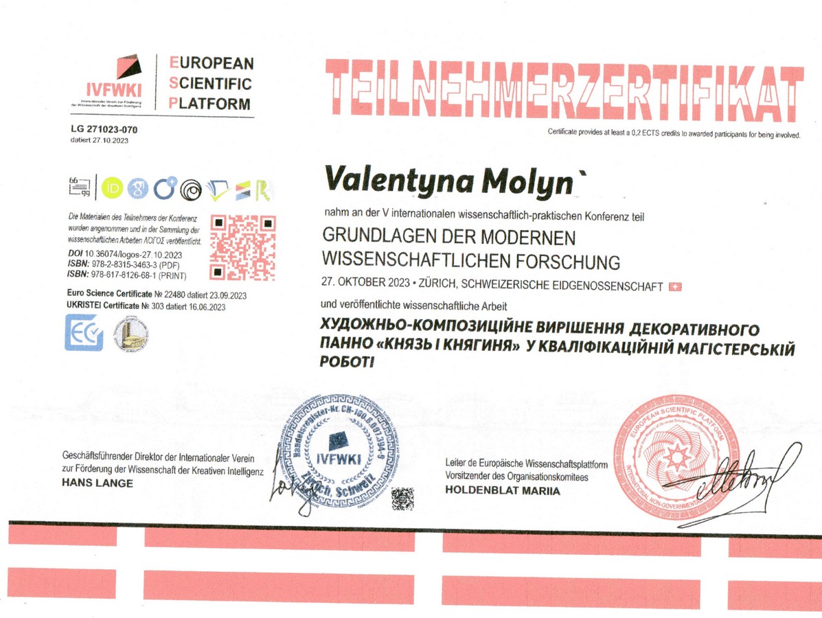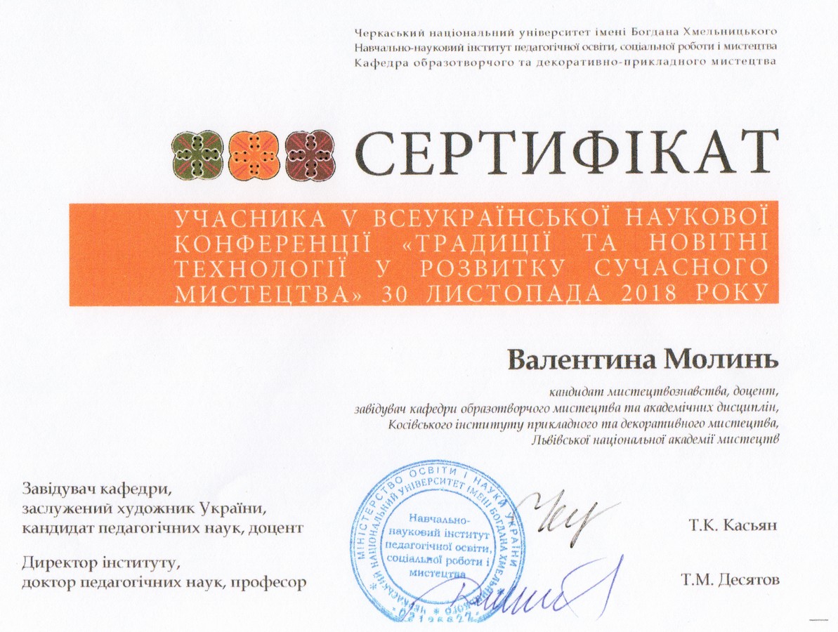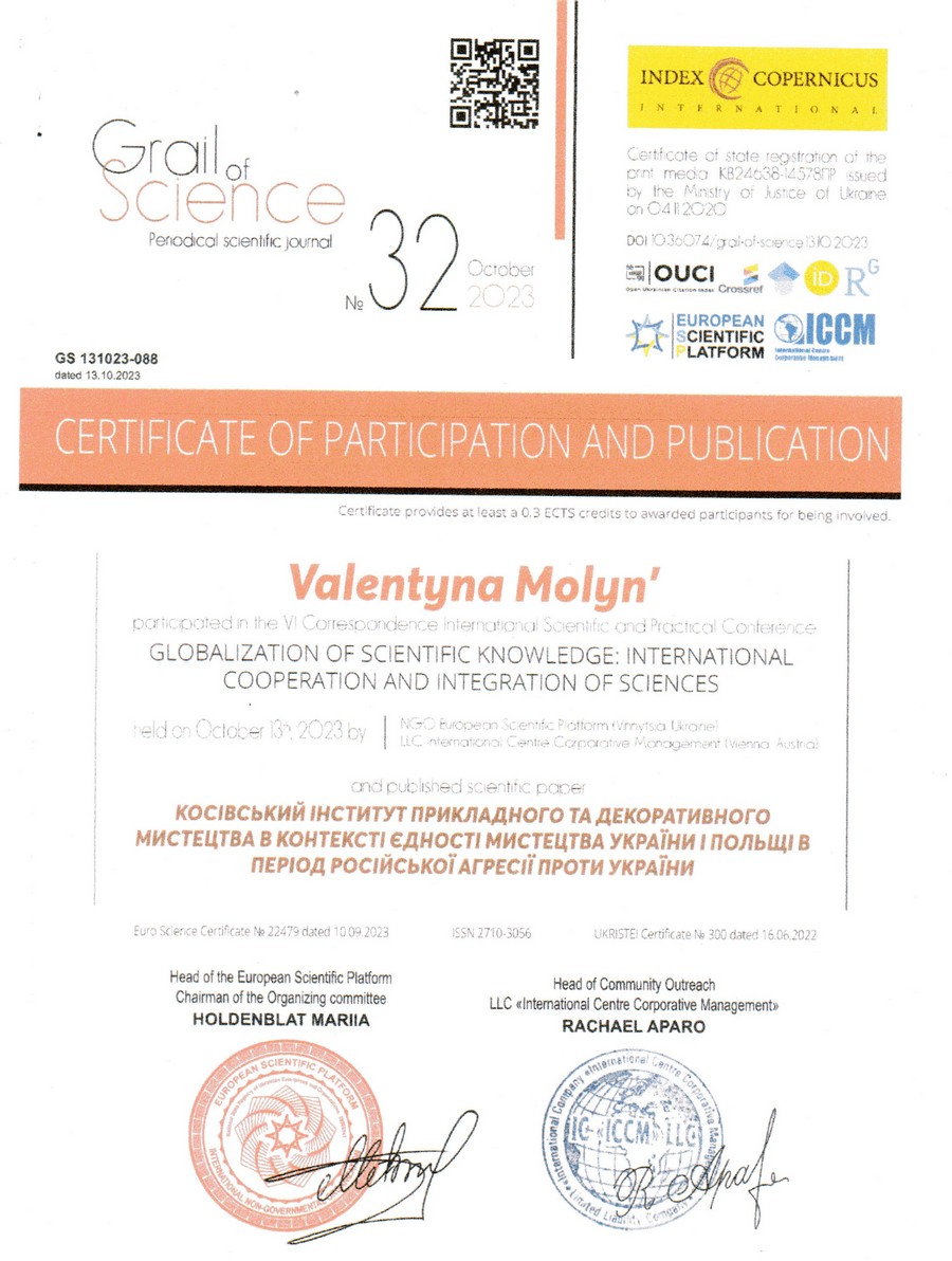 Молинь В., Кармеліта Ф. Авторська концепція вирішення вітражних композицій для інтер’єру Косівського інституту ПДМ ЛНАМ у кваліфікаційній магістерській роботі. SCIENTIFIC COLLECTION «INTERCONF». № 2 (38), December, 2020. 1376 р. Збірник матеріалів І Міжнародної науково-практичної конференції “SCIENCE, EDUCATION, INNOVATION: TOPICAL ISSUES AND MODERN ASPECTS”. Таллін (Естонія). Р. 767-771. 16-18 грудня 2020 р. ISBN 978-5-7983-4322-5.