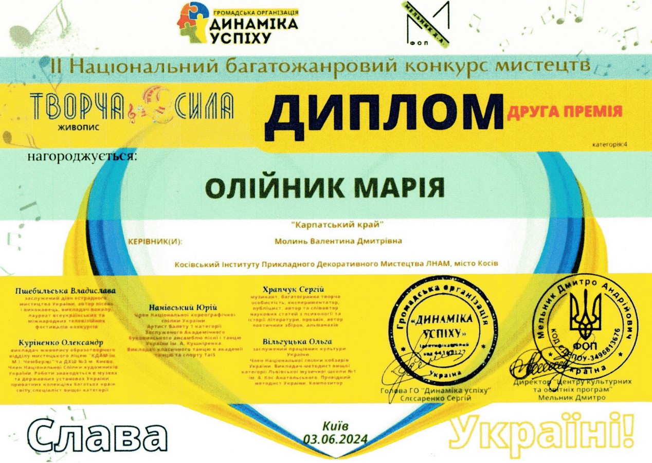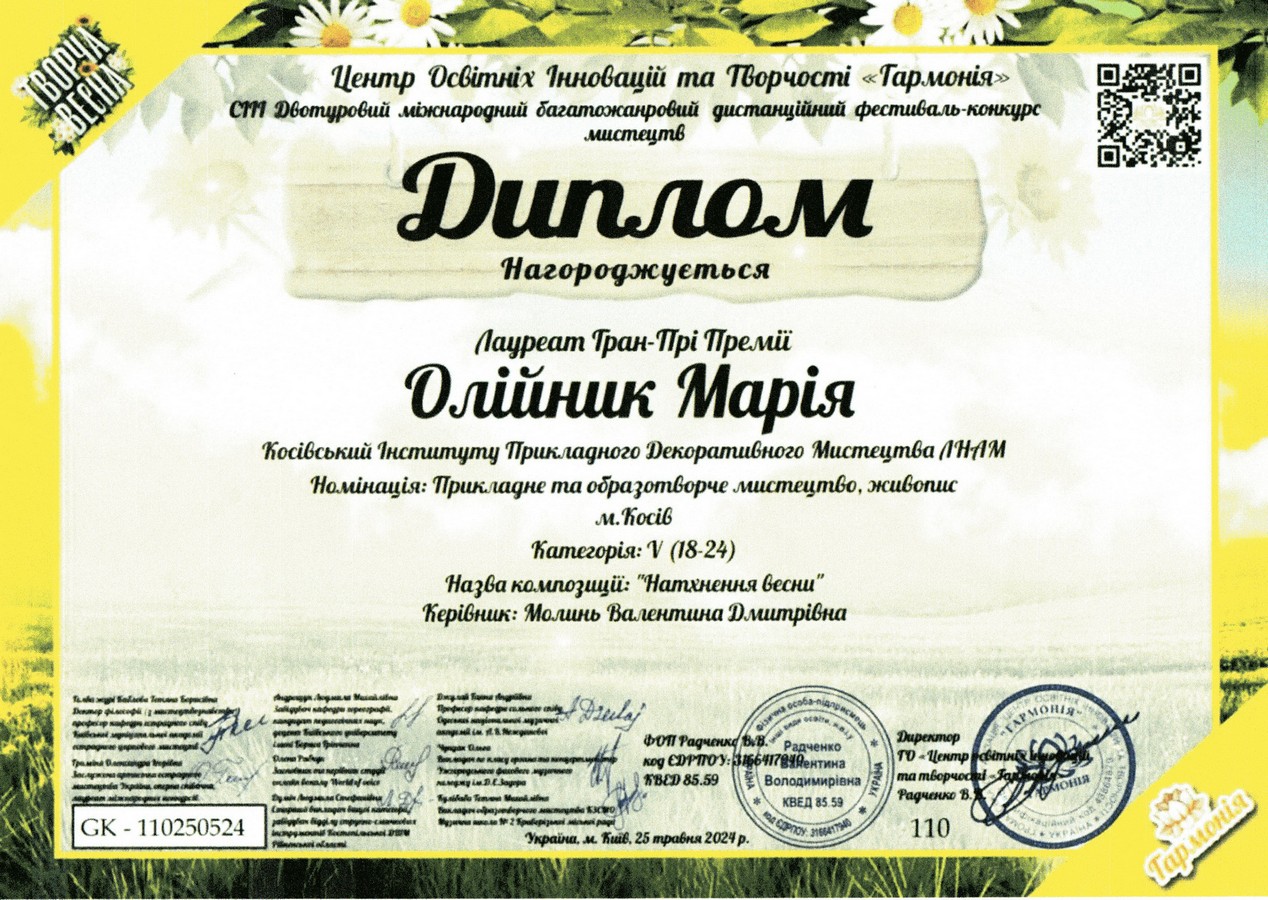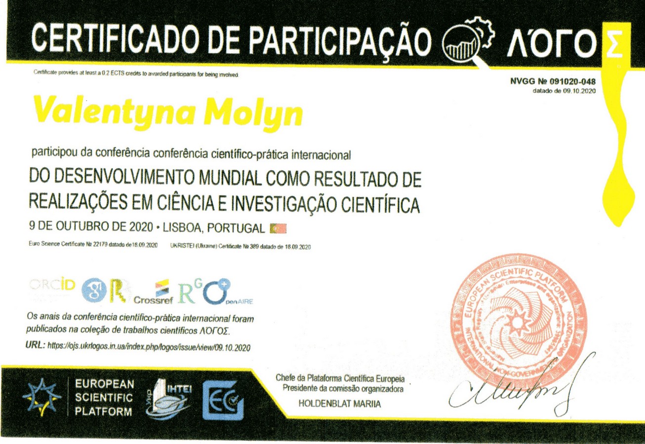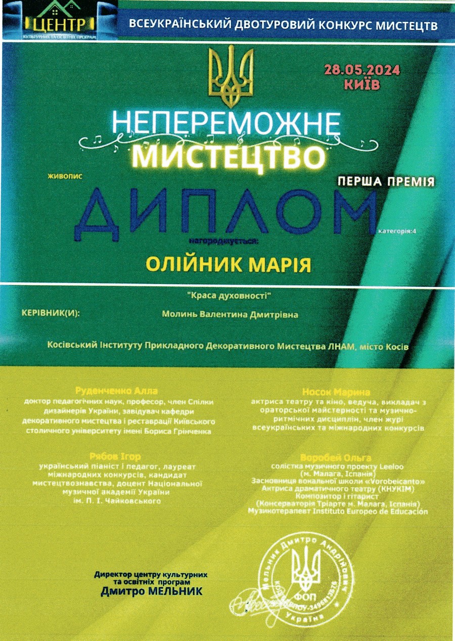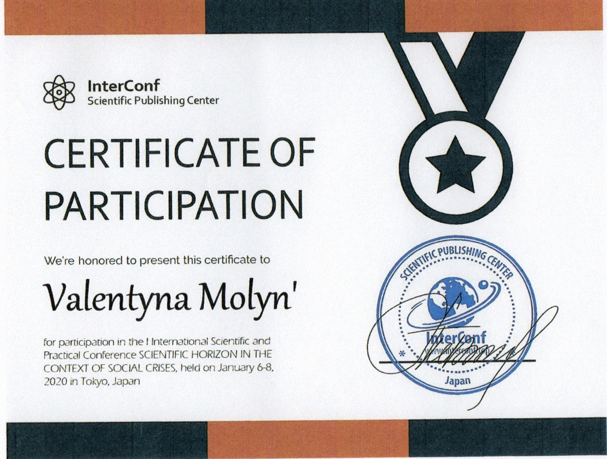 Молинь В., Кармеліта Ф. Авторська концепція вирішення вітражних композицій для інтер’єру Косівського інституту ПДМ ЛНАМ у кваліфікаційній магістерській роботі. SCIENTIFIC COLLECTION «INTERCONF». № 2 (38), December, 2020. 1376 р. Збірник матеріалів І Міжнародної науково-практичної конференції “SCIENCE, EDUCATION, INNOVATION: TOPICAL ISSUES AND MODERN ASPECTS”. Таллін (Естонія). Р. 767-771. 16-18 грудня 2020 р. ISBN 978-5-7983-4322-5.