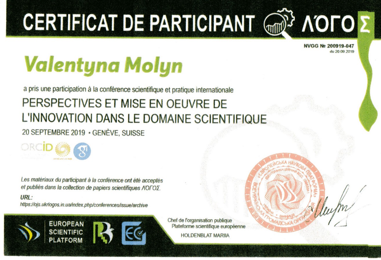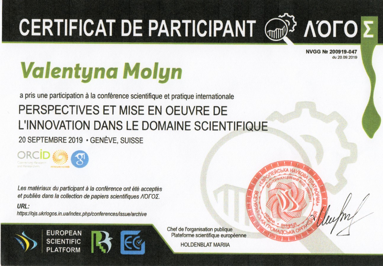 Міжнародна наукова конференція "Perspectives et mise en oeuvre de l'innovation dans le domaine scientifique", 20 septembre 2019, Genève, Suisse. Тема доповіді: "Володимир Шухевич у дослідженні народного мистецтва Гуцульщини".