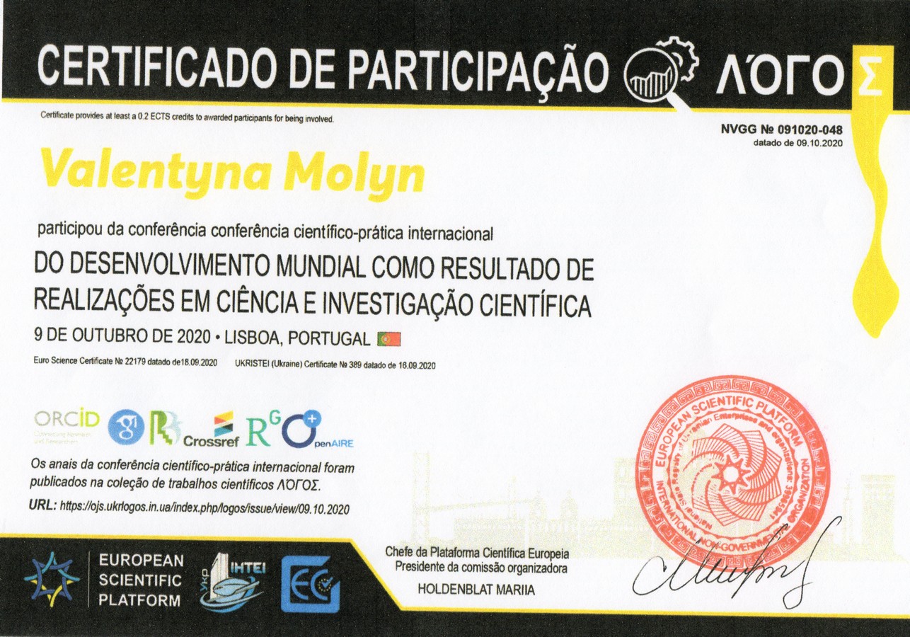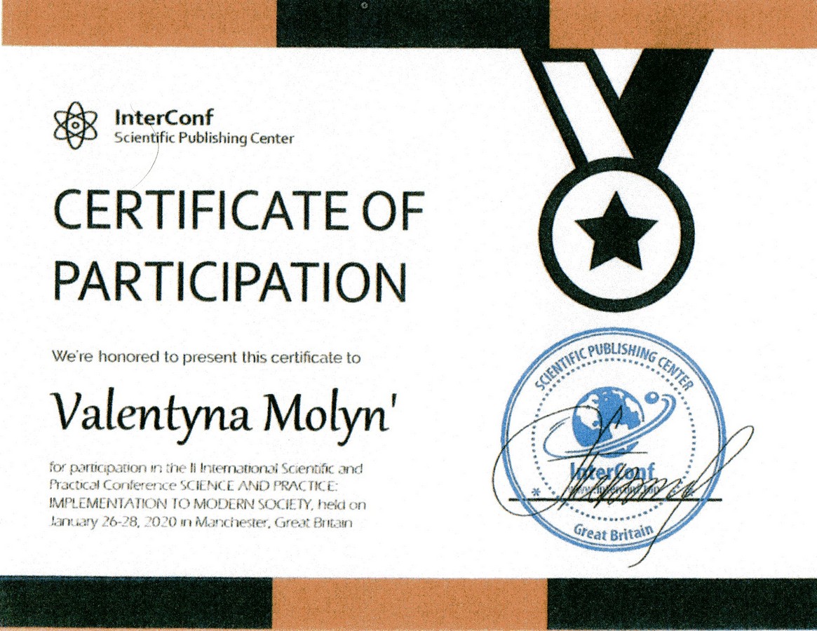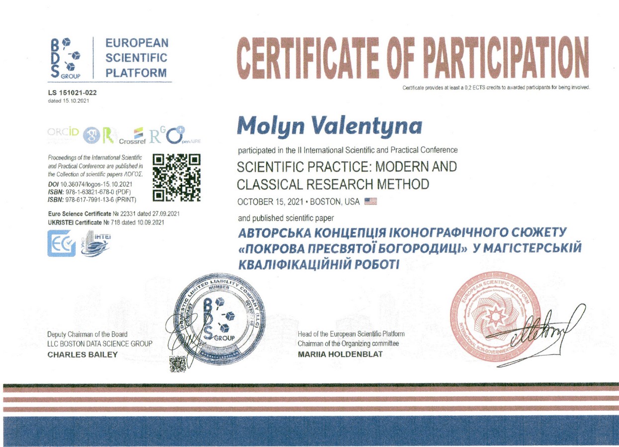 Молинь В., Богданець О. Авторська концепція іконографічного сюжету «Покрова Пресвятої Богородиці» у магістерській кваліфікаційній роботі. ЛОГОС.SCIENTIFIC PRACTICE: MODERN AND CLASSICAL RESEARCH METHODS: збірник наукових праць з матеріалами ІІ Міжнародної науково-практичної конференції, м. Бостон, 15 жовтня 2021. Вінниця-Бостон: Європейська наукова платформа, Primedia eLaunch LLC, 2021.204 с. С.192-195. ISBN 978-617-7991-78-5