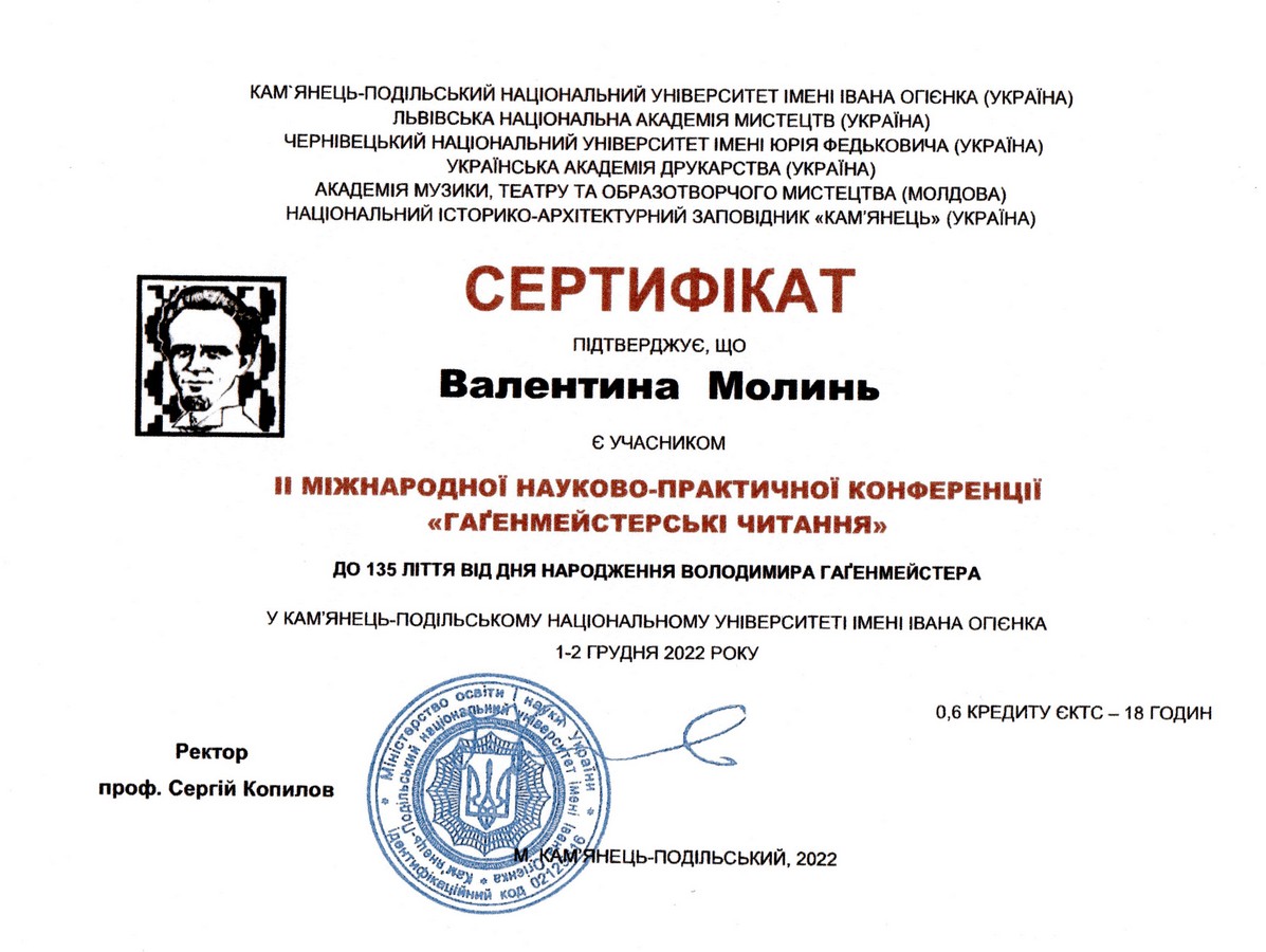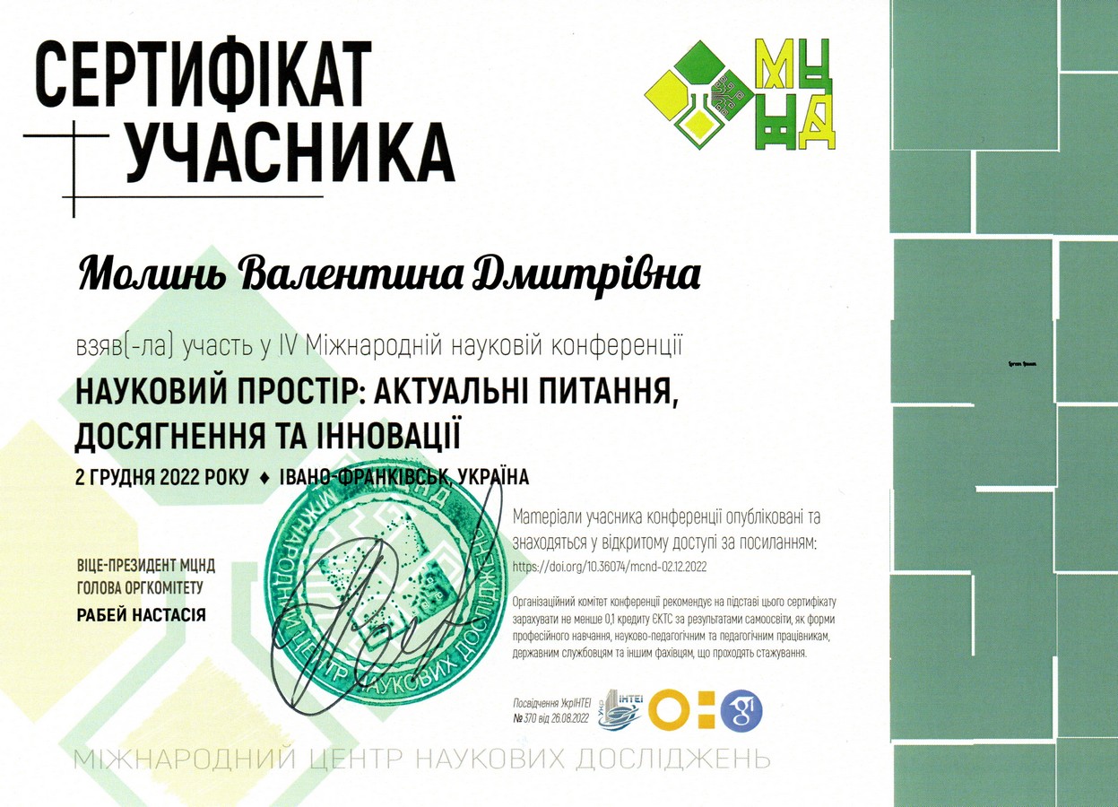 І Міжнародна науково-практична конференція «MODERN RESEARCH IN WORLD SCIENCE» м.Львів, 17-19 квітня 2022 р. Тема доповіді: «Мистецький ужинок заслуженого художника України Мирослава Богдановича Радиша»