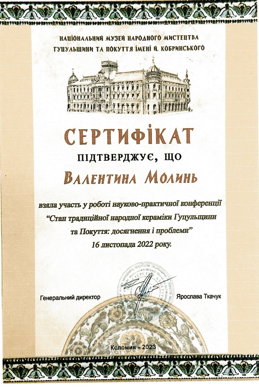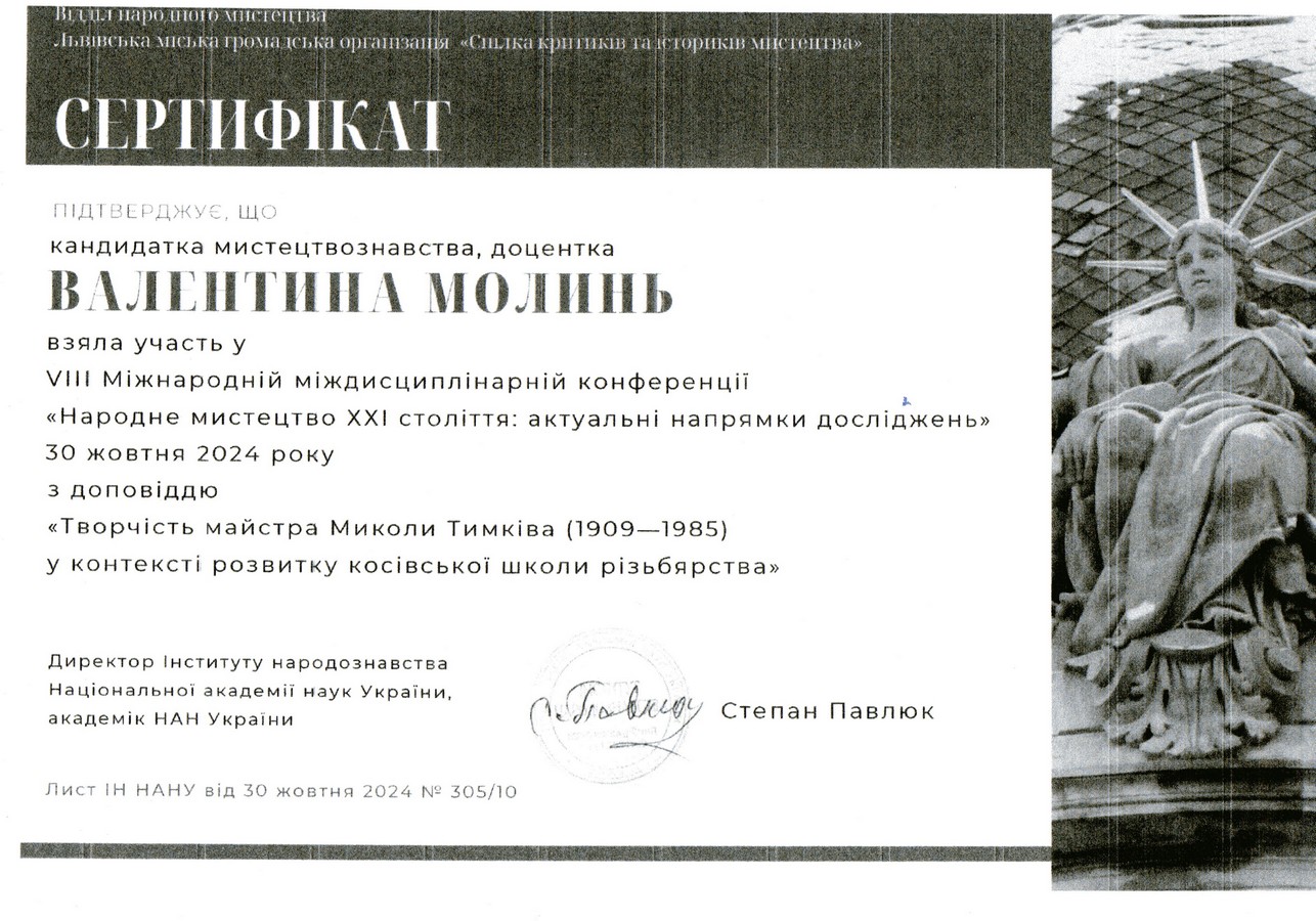 Молинь В. Володимир Шухевич у дослідженні народного мистецтва Гуцульщини. Perspectives et mise en oeuvre de linnovation dans le domaine scientifique: сollection de papiers scientifioues «ЛОГОС» aves des materiaux de la conference scientifioue et pratique international (Vol. 2), 20 septembre 2019. Geneve, Suisse: Platforme scientifioue europeenne. Р. 110-114.