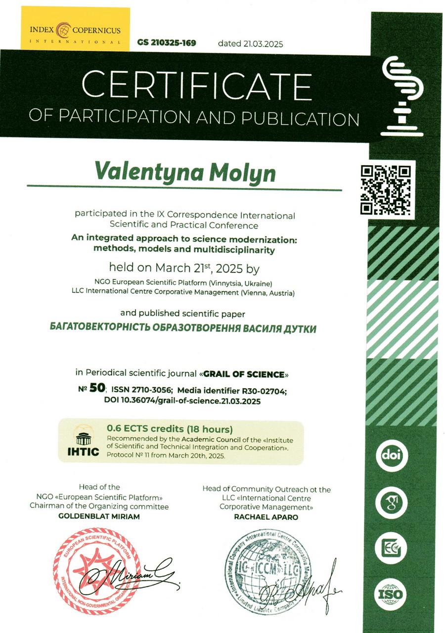 Юрчишин Г. М. Дутка В.В., Щербина Н.М., Молинь В.Д., Попенюк В.М., Стеф’юк Р. Г. Методика підготовки магістерської роботи: робоча програма навчальної дисципліни для студентів ОПП “Декоративне мистецтво”, Косів: КІПДМ ЛНАМ, 2022. 16 с.