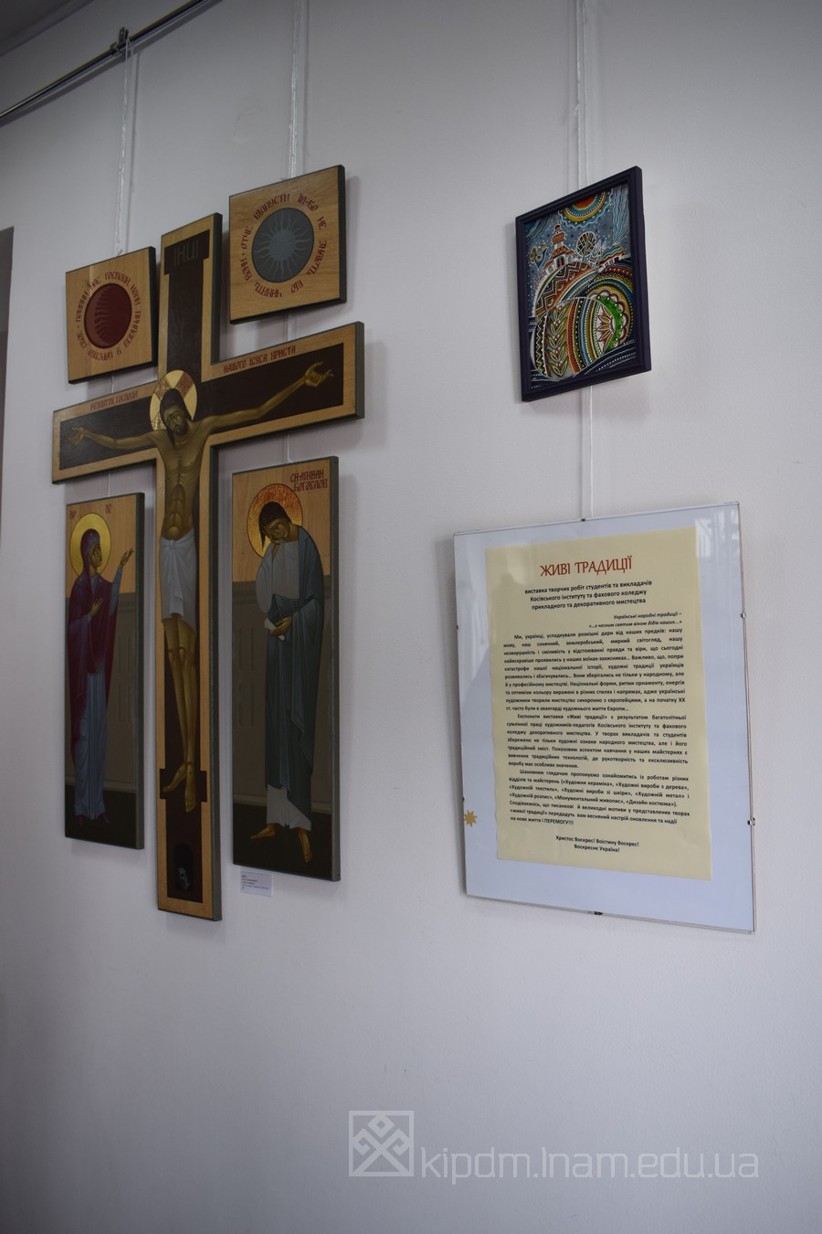 Експонати виставки «Живі традиції» є результатом багатолітньої сумлінної праці художників-педагогів Косівського інституту та фахового коледжу декоративного мистецтва. У творах викладачів та студентів збережено не тільки художні ознаки народного мистецтва, але і його традиційний зміст. Показовим аспектом навчання у наших майстернях є вивчення традиційних технологій, де рукотворність та ексклюзивність виробу має особливе значення.